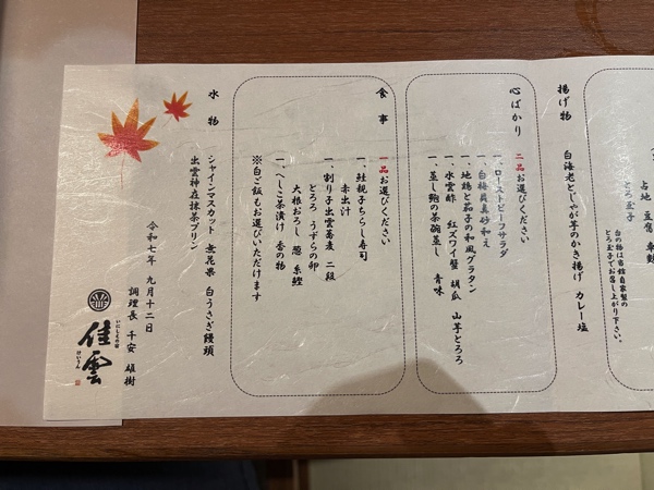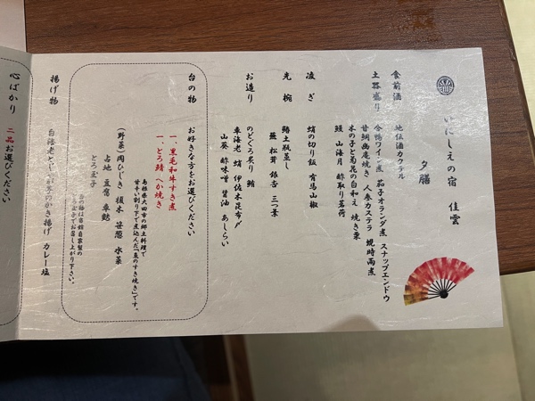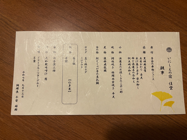 今回の夕食のお品書きは画像のようになっていました。
