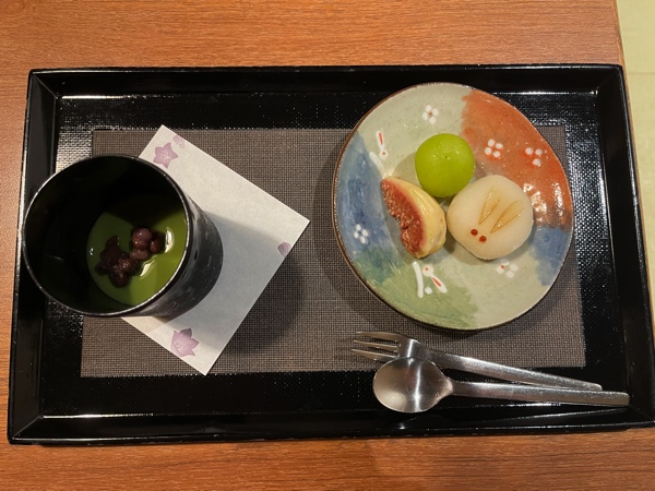 最後に水物でシャインマスカット、いちじく、抹茶プリン。