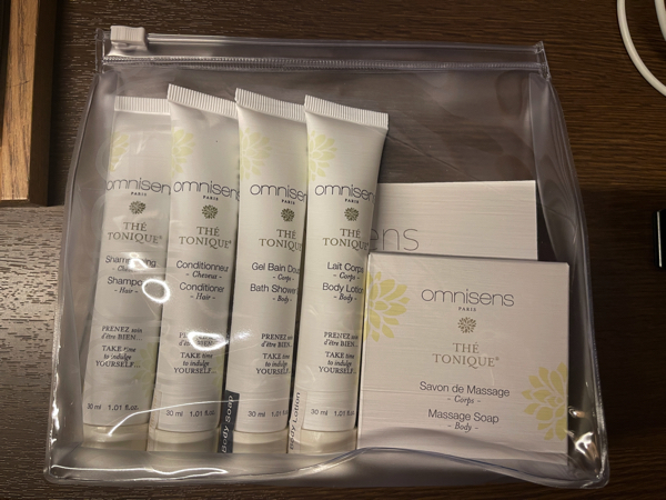 パレスホテルやヒルトンなど高級ホテルでのスパトリートメントや、その他多くの宿泊施設で使用されている「omnisense paris」のアメニティが置かれていました。